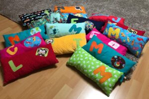 Kissen mit den Anfangsbuchstaben der Kinder, die aus dem Kindergarten entlassen wurden, haben viel Freude bereitet.